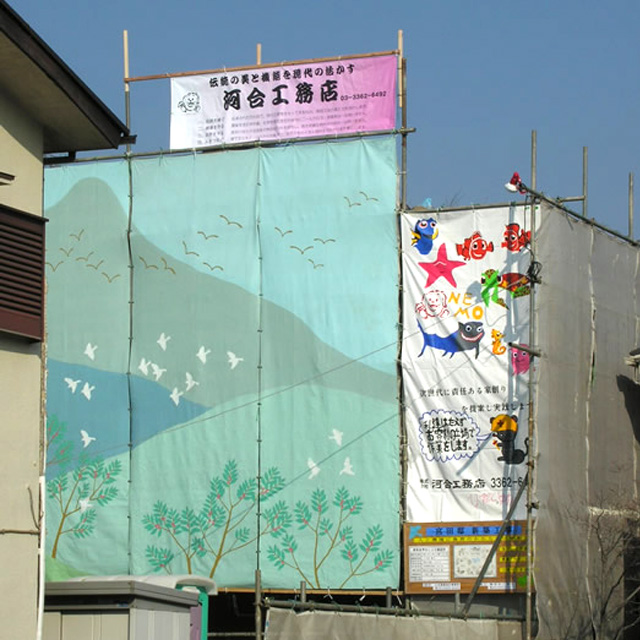 汚いイメージを払拭したいというので、現場の建物に掛けるシートに壁画を描いて欲しい、という工務店からの珍しい依頼があった。