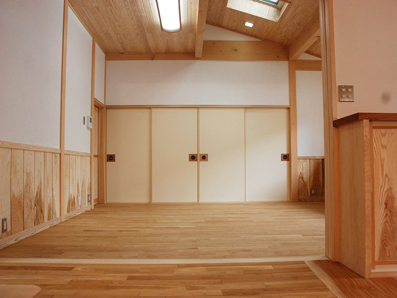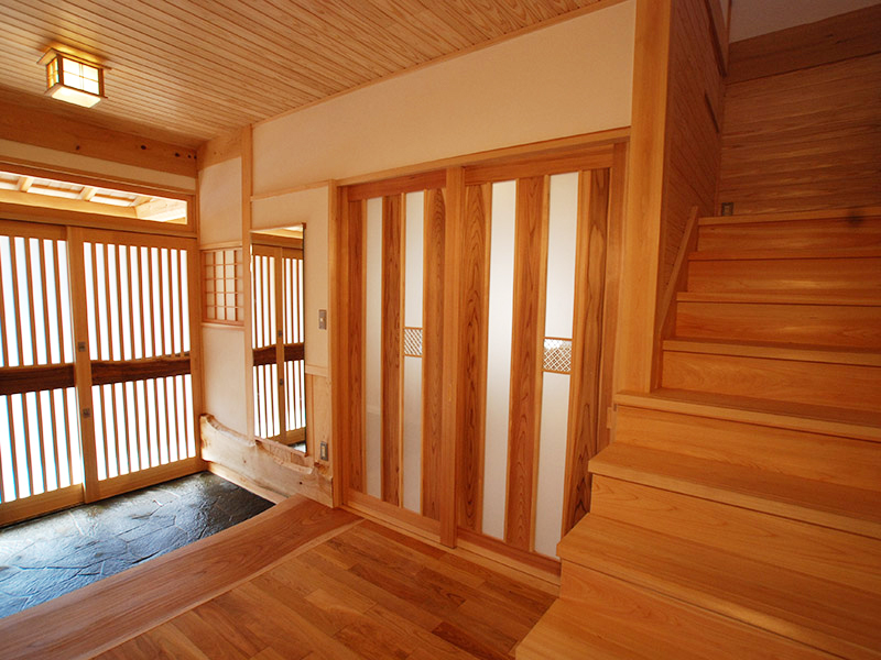 素材は、見える部分、見えない部分に限らず、すべて自然素材、国産材を使用。海外の遠い豊かな森を乱伐して木を得る「環境破壊型」でなく、国内の伐るべき木を利用して林業を盛りたてる「環境共生型」の家づくりを私たちは目指しています。それには、接着剤に頼らず、伝統的墨付け、手刻みなど、職人たちの手による心のこもった仕事が絶対に必要なのです。「美」と「環境」を追求したH邸は、自然と一体となれる、呼吸の楽な家になりました。