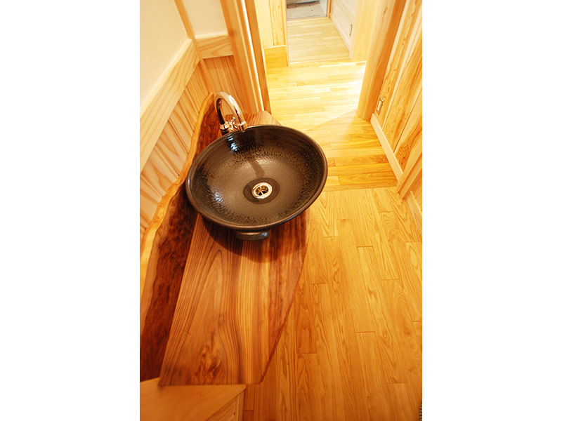 室内も工夫をこらしました。「天井は高め」と要望されたことから、通常は柱の長さ3mのところを3.6m加工して立て、圧迫感のない開放的なリビングとなりました。構造材には多くは杉が使用されますが、柱・梁ともに、耐久性・耐水性の優れた桧を使用。大黒柱は、当社所要の栃木の山で、H様立ち合いの元に伐採された杉の丸太で、思い出深いもの。床柱には、天然の絞り丸太ほか、屋久杉、イチョウ、槙などで彩りました。まさに、選りすぐりの国産木材の展示場のよう。国産の多種多様な自然木を大量にストックしている、当社だからできること。
